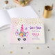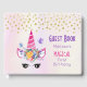 Un livre d'or magique conçu avec une licorne rose tendance. Orné d'une tête fleurie de fantaisie. Des papillons Whimsical volent autour de nous. De faux confettis en or parsemés le long du sommet. Un arrière - plan d'aquarelle jaune et violet pâle.