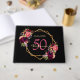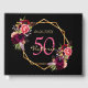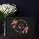 Un Livre d'Invité pour une fête d'anniversaire de 50e (ou de n'importe quel âge). Un arrière - plan noir chic avec un cadre géométrique en faux or. Décoré de fleurs violettes foncées et bordeaux, de plumes roses et boho. Modèles pour un nom, 50 ans et une date. Date de naissance ou date de la fête. Le nom est écrit avec un script de style manuscrit, des lettres de couleur rose, l'âge en violet et la date avec des chiffres d'or. Texte sur l'épine.