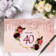 Un livre d'hôtes pour une fête de 40e anniversaire. Un arrière - plan chic, doré et rose vif, avec un cadre géométrique en faux or. Décoré de fleurs violettes foncées et bordeaux, de plumes roses et boho. gouttes d'or rose, le regard goutte-à-goutte de peinture sur l'avant et le dos. Modèles pour un nom, âge 40 et une date. Date de naissance ou date de la fête. Le nom est écrit avec un script de style manuscrit, des lettres de couleur rose, l'âge en violet et la date avec des nombres noirs. Ajoutez votre texte sur la colonne vertébrale.