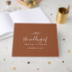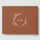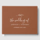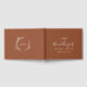Ce livre d'hôtes mariage en terre cuite minimale en feuille est parfait pour un mariage de saumons. Le design se compose d'une simple silhouette de feuille de verdure orangée brûlée et minimaliste de style bohème désert. Personnalisez la couverture avant avec les noms du couple et la date du mariage.