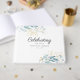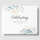Elégant livre d'hôtes blanc "Célébration de la vie" vert-bleu-or. Élégante, belle police d'écriture.