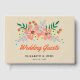 Ce livre d'or mariage présente un graphique floral dessiné à la main qui offre les couleurs : jaune, orange, gris et vert. La couleur arrière - plan est kaki tan, bien qu'elle puisse être changée en n'importe quelle couleur disponible en choisissant customiser. Le texte personnalisé vous permet d'ajouter les noms de la mariée et du marié ainsi que leur date de mariage.