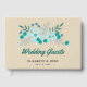 Ce livre d'or mariage présente un graphique floral dessiné à la main qui offre les couleurs : bleu, tons turquoises, gris et vert. La couleur arrière - plan est kaki tan, bien qu'elle puisse être changée en n'importe quelle couleur disponible en choisissant customiser. Le texte personnalisé vous permet d'ajouter les noms de la mariée et du marié ainsi que leur date de mariage.