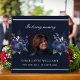 Un livre d'hôtes pour un service commémoratif ou funéraire. Un arrière - plan bleu foncé, aux fleurs bleues. Personnalisez et ajoutez une photo, un nom et des dates.