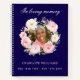 Un livre d'hôtes pour un service commémoratif ou funéraire. Arrière - plan classique bleu foncé, décoré d'une couronne fleurie rose et blanche. Personnalisez et ajoutez une photo, un nom et des dates.