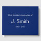 Ce livre d'or funéraire ou mémorial présente le message "Nos souvenirs les plus affectueux de", ainsi que le nom personnalisé et les dates de naissance et de décès de l'individu qui est décédé. Il présente du texte gris clair sur un arrière - plan bleu. Il pourrait être utilisé pour enregistrer de bons souvenirs de quelqu'un qui est récemment décédé.