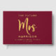 Ce livre d'or de mariage couleur bordeaux chic est parfait pour que vos invités laissent des mots de conseils et de vœux. Il comporte une feuille d'or, "Mme" écrit en élégante écriture, ainsi que le nom de la mariée et la date de la douche. Personnalisez le titre sur la colonne vertébrale pour rendre ceci un souvenir vraiment spécial.