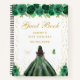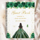 Ce livre d'or élégant et glamour présente une belle princesse aux cheveux foncés et à la peau foncée dans une robe de boule verte. Le texte combine écriture manuscrite et polices sans serif modernes pour un look élégant et sophistiqué. Les compositions florales, les papillons et les confettis d'or créent un mélange parfait de rustique et de chic. Graphiques par www.etsy.com/uk/shop/SunflowerDayLove