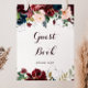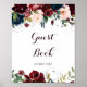 Ce panneau de livre d'or floral automnal illustré à l'aquarelle est parfait pour un mariage simple ou une fête de mariage. Le design présente des roses et des pivoines artistiquement peintes à la main à l'aquarelle bleu marine, bordeaux, rouge et rose pâle avec des feuilles vertes élégantes, inspirant la beauté automnale idyllique colorée.
