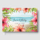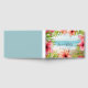 Le livre d'hôtes mariage d'inspiration insulaire présente un paysage de plage tropicale aquarelle encadré de feuilles de palmiers et de fleurs d'hibiscus roses et coralliens. L'envers est bleu océan massif. Personnalisez-le avec vos propres noms et date de mariage pour un souvenir unique.