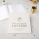 The phrase “Love & Laughter Live Here” is stamped using genuine foil, giving the cover a truly premium finish. A high-quality hardcover binding and ribbon bookmark make this book perfect for displaying at your reception and treasuring long after the celebration.