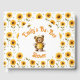 Un mignon ours en peluche habillé comme une abeille au miel. Deux abeilles volent au-dessus du texte contre un arrière - plan de jolies fleurs jaunes au centre marron. Tout le texte peut facilement être modifié à vos informations.