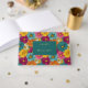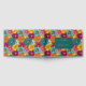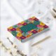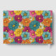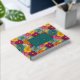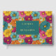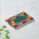 This vibrant wedding guest book cover features a lively floral pattern with large, stylized flowers in shades of pink, yellow, orange, and teal arranged in a grid-like layout. The central dark teal frame with gold accents highlights customizable text for names and dates, set against the colorful backdrop. The design combines modern typography with playful, abstract florals to create an energetic yet sophisticated aesthetic, perfect for celebrating joyous occasions like weddings.