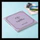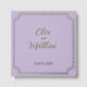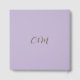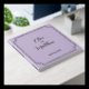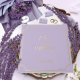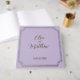livre d'hôtes mariage dans les tons doux lilas avec lettrage en feuille d'or écrit avec des polices de script et de serif, avec les noms de couple et la date de mariage à l'intérieur d'un cadre doré à l'avant et des initiales de couple à l'arrière