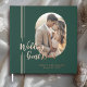 Un livre d'invités de mariage unique et élégant, avec une véritable feuille d'or rose et un style moderne sur un arrière - plan vert émeraude populaire. Le design comporte un modèle photo ovale pour inclure votre photo sélectionnée. Le texte du livre d'hôtes mariage est épelé dans la typographie de script moderne et est accentué avec des graphiques en ligne simples. Personnalisez le modèle de texte avec vos noms et votre date de mariage. La colonne vertébrale de ce livre d'hôtes a également un modèle de texte à personnaliser comme vous le souhaitez. Vous avez le choix entre 3 nuances de feuille d'or : or rose (ici), or ou argent.