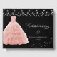 Recueillez le nom et les messages de votre invité dans ce magnifique rose vif au design arrière - plan noir. Feux à cordes en haut avant et photo en arrière. Robe princesse rose vif avec dessus de parties scintillant brillant. Script Quinceañera texte avec nom et date, motif tourbillonnant, et parties scintillant en bas à droite.