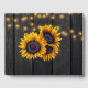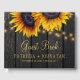 Rustique pays vintage de style traditionnel livre d'hôtes personnalisé avec de grands tournesols d'or jaune et des cordes de lumières scintillantes sur un arrière - plan de grange brun foncé et avec élégant script de typographie or. Idéal pour l'été ou l'automne | élégant pays rustique | jardin extérieur jardin à thème mariages.