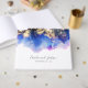 Cet élégant livre d'or moderne conviendra parfaitement aux mariages contemporains et conviendra aussi bien à un livre d'or fiançailles qu'à un livre d'or. Le joli design présente une superbe aquarelle sur le devant qui comprend des nuances riches de bleu cobalt, turquoise et mauve améthyste, avec des accents d'or partout. Vos noms et la date du mariage apparaissent sous l'aquarelle. Le dos est également décoré d'aquarelle, et comprend votre nom de famille monogramme initial. La colonne vertébrale du livre d'or contient vos noms et votre date mariage. Trouvez la papeterie mariage de coordination dans notre collection Mystical Modern Ink Wash mariage.
