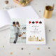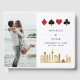 Livre d'or de mariage de destination moderne et élégant à Las Vegas. Le design présente l'horizon de la ville de Las Vegas en or, les icônes de trèfles, de carreaux, de cœurs et de piques en or dans un cadre élégant, 2 photos et des détails en lettrage tendance sur la couverture.