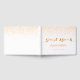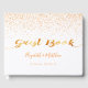 Un livre d'or pour une mariage moderne, élégante et glamour. Un arrière - plan blanc chic avec des confettis dorés. Le texte : Guest Book est écrit avec des lettres en faux or tendance. Les noms et la date sont écrits avec un script de style manuscrit. Modèle pour votre texte sur la colonne vertébrale.
