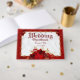 Roses rouges exquises, filigree or, satin blanc, et un arrière - plan métallique rouge simulé se réunissent dans ce luxueux design mariage. Personnalisez le livre d'or avec vos propres détails pour votre journée spéciale.