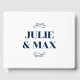 Créez votre propre livre d'hôtes simple bleu foncé moderne pour votre mariage. Le texte et les éléments florissants de style dessinés à la main sont personnalisables si vous avez besoin qu'ils correspondent à votre palette de couleurs. Vous pouvez ajuster la taille de la police pour des prénoms plus longs. Vous pouvez également modifier l'arrière - plan blanc solide pour qu'il corresponde à votre palette de couleurs. Conservez ou supprimez le texte TOUS les CASQUETTES sur la colonne vertébrale.
