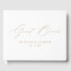 Elégant livre d'or de mariage avec "Guest Book" exposé dans un script de calligraphie or moderne sur un arrière - plan blanc. Personnalisez l'avant du simple livre d'hôtes mariage avec vos noms et votre date de mariage. Le verso du livre d'or affiche vos initiales monographiques. Ajoutez votre nom et votre date de mariage à la colonne vertébrale du livre d'or.