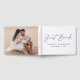 Livre d'invités de mariage simple et élégant, avec un script noir écrit à la main, mélangé avec du lettrage moderne contre un arrière - plan blanc. Personnalisez le livre d'hôtes minimaliste du mariage avec vos noms et votre date de mariage. Ajoutez du texte personnalisé à la colonne vertébrale du livre d'or comme vos noms, la date, etc. L'arrière du livre d'or affiche votre photo fiançailles horizontale. Le livre d'hôtes chic noir et blanc de la mariage est parfait pour les mariages modernes.