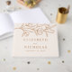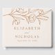 Elégant livre d'hôtes à fleurs florales avec des fleurs dessinées en cuivre et des feuilles près du sommet du design avec un arrière - plan d'amande. Personnalisez le livre d'hôtes du mariage botanique avec vos noms et les détails du mariage ci-dessous. Ajoutez du texte personnalisé à la colonne vertébrale comme vos noms, votre date de mariage, etc. L'arrière du livre d'hôtes fleuri est orné de votre photo fiançailles horizontale. Conçu pour coordonner avec notre collection de mariages floraux esquissés.