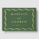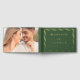 Ajoutez une touche de fantaisie personnalisée à votre célébration mariage avec ce livre d'or moderne vert et Wavy Frame photo ! Le design présente les noms du couple et la date du mariage en papier peint entouré d'un cadre ondulé avec un arrière - plan vert. Ajoutez votre texte personnalisé à la colonne vertébrale du livre d'or du mariage de feuille. L'arrière du livre d'hôtes rétro mariage affiche votre photo horizontale.