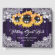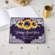 Complétez votre mariage violet rustique avec ce livre d'hôtes à fleurs mariage avec des tournesols sur un arrière - plan en bois rustique orné de dentelle fleurie blanche et de lampes à cordes. Éléments correspondants disponibles.