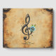 Mechanical clef and flowers to the beat of the clocks. A steampunk-style treble clef, rendered in dark metal with bronze accents and intricate detailing. The clef is adorned with blue flowers that have clock faces at their centers, adding a whimsical touch. Musical notes float near the clef, and small droplets hang from its curves.