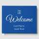 À l'avant de ce livre d'invités bleu, il y a trois lignes de texte d'affichage blanc que vous pouvez modifier pour créer un message personnalisé (Montré : Nom de l'événement d'accueil Livre d'invités). La deuxième ligne de texte d'affichage apparaîtra également sur la colonne vertébrale. Le bleu est le code couleur hexadécimal #004095.