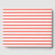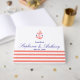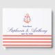 Carrelage rose corail monogrammé et ancre nautique avec accent bleu marine mariage livre d'or. Le design comprend un motif rayé rose corail et blanc, une ancre nautique rose corail avec les initiales de mariée et mariée en bleu marine, ainsi que les noms de mariée et mariée et la date.