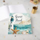 Beautiful baby shower guest book with a nautical black and white lighthouse, starfish and shells. Perfect for a baby shower. The words can be changed to suit your own details or requirements