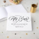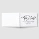 Élégant livre d'or de mariage blanc pour un 50ème anniversaire de mariage avec un script calligraphié noir tourbillonnant et vos noms dans une police élégante. Livre d'or de 50ème anniversaire de mariage personnalisé avec vos noms, date de mariage et une citation. Livre d'or de célébration d'anniversaire de mariage or imprimé avec vos noms en noir sur fond blanc.