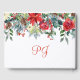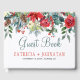 Aquarelle hiver botanique saisonnière fleurs rouges, cônes de pin, bordures de branches de houx et de baies et de sapin, et votre script personnalisé en typographie rouge faisant un beau mariage personnalisé marié et noms de mariés et monogramme livre d'invités. +++++++++++ Facile à personnaliser et parfait pour les mariages floraux de Noël hivernaux, anniversaires, fêtes ou autres fêtes de couple.