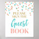 Veuillez signer notre pancarte de livre d'or de mariage en bleu sarcelle turquoise, motif confettis or et rose corail avec lettrage écrit à la main. Parfait pour les mariages, les baby showers, les fêtes de fiançailles, les anniversaires et plus encore.