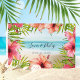 Livre d'or de mariage inspiré des îles avec un paysage de plage tropicale à l'aquarelle encadré de feuilles de palmier et de fleurs d'hibiscus rose et corail. Le verso est d'un bleu océan uni. Personnalisez-le avec vos propres noms et date de mariage pour un souvenir unique.