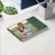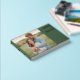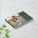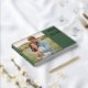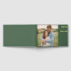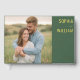 Cette couverture de livre d'or de mariage présente un design divisé avec une photographie chaleureuse et romantique de deux personnes s'étreignant dans un cadre extérieur sur la gauche, entourée de hautes herbes et de tons naturels doux. Le côté droit présente un fond vert foncé uni avec une typographie élégante et moderne en jaune doré pour les noms et les détails personnalisables. La mise en page est équilibrée, créant un charme contemporain et rustique qui transmet la chaleur et l'intimité, parfait pour célébrer l'amour et les moments spéciaux.