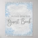Panneau de table pour livre d'or de baby shower sur le thème de winter wonderland avec un joli fond pailleté de flocons de neige bleus et argentés. Ajoutez simplement le texte de votre choix dans le style de police et la couleur que vous préférez. Ces panneaux de table sur le thème de winter wonderland sont beaux dans un cadre décoratif posé sur votre table d'événement.