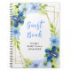 Ce beau et élégant livre d'or pour une fête prénuptiale présente des fleurs bleues et navy aquarelles avec du feuillage sur un cadre géométrique doré. Le texte combine une écriture manuscrite et des polices serif pour un look stylé et moderne. C'est parfait pour une fête prénuptiale rustique de printemps ou d'été.