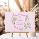 Un arrière - plan rose pâle. Décoré d'une crête rose, de fleurs roses et violettes, de fleurs, de fleurs. Avec une croix d'or. Personnalisez et ajoutez un nom et une date. Épine : ajoutez votre texte.