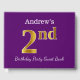 Ce livre d'or présente le numéro ordinal "2e" avec une apparence de faux or. Il porte également un nom customisé et un arrière - plan de couleur violette. Il pourrait être utilisé à une fête pour quelqu'un célébrant son deuxième anniversaire. [~Z0000057]