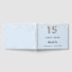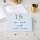 Un arrière - plan élégant bleu bébé avec parties scintillant faux argent, éclat et numéro 15 écrit avec une police de style ballon. Ajoute ton nom, date. Épine : ajoutez votre texte.