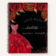 Pour une Quinceañera, fête du 15e anniversaire. Un arrière - plan noir aux étincelles rouges, une robe rouge et des roses rouges, des fleurs. Le nom est écrit avec un script de style moderne écrit à la main avec des swashes. Personnalisez et ajoutez un nom et une date. Pour que les swashes ne suppriment que le nom de l'échantillon, laissez les espaces ou émoticônes devant et après le nom.