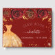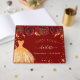 Pour une Quinceañera, fête du 15e anniversaire. Un arrière - plan rouge avec de la poussière de parties scintillant en faux or, une robe et des roses rouges, des fleurs. Le nom est écrit avec un script de style moderne écrit à la main. Personnalisez et ajoutez un nom et une date. Épine : ajoutez votre texte.