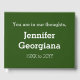 Ce livre d'or minimaliste sur la sympathie funéraire et commémorative contient le message "Vous êtes dans nos pensées", ainsi que le nom et la date de naissance et de décès de l'individu qui est mort. Il a du texte blanc sur un arrière - plan vert foncé. Il pourrait être utilisé pour enregistrer des souhaits sympathiques pour les proches et les amis de quelqu'un qui est récemment décédé.