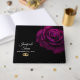 Un livre d'or de mariage avec une image en gros plan d'une rose magenta violet de style gothique. Un style sombre et mystérieux. 2 anneaux de mariage dorés sous le texte personnalisé.