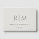 An elegant wedding guest book featuring a soft gray monogram design, with ghosted initials placed above the couple's first names, and accented by a refined botanical element. The names and accent are printed in rich gray, offering graceful contrast against an ivory faux linen background. Inside, the pages are lined for guests to leave messages, names, and well wishes. Minimalist and timeless, this design blends quiet texture with subtle detail, creating a meaningful keepsake for your wedding day.